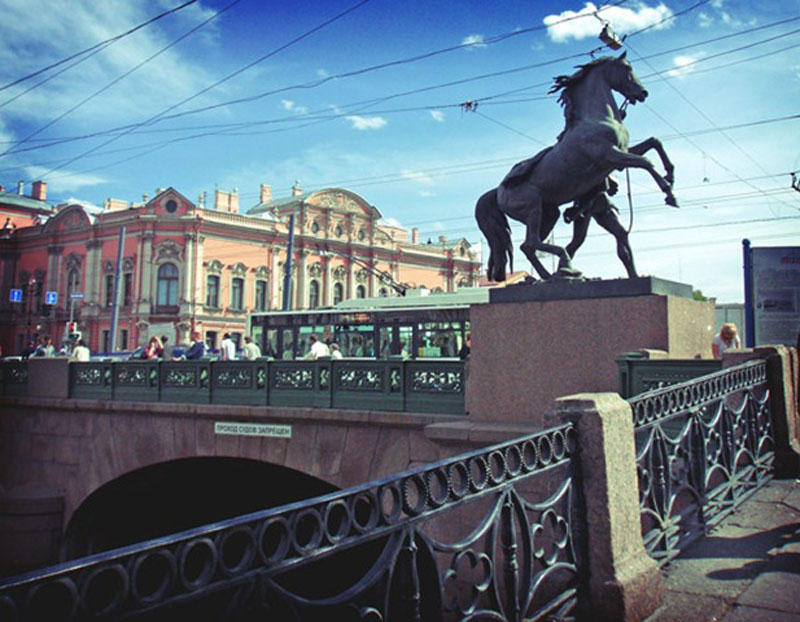 Один из таких мостов, Аничков, имел необычную судьбу. Сперва он тоже был с башенками и цепями. Но скоро он стал тесен — ведь по нему Фонтанку пересекала главная улица Петербурга, Невский проспект. Около 1840 г. его построили заново, во всю ширину улицы, но уже без башенок. Вместо них по углам моста поставили четыре крупные скульптурные группы, изображающие борьбу человека с конем. Их отлил из бронзы скульптор барон Петр Клодт. Эти замечательные скульптуры делают Аничков мост одним из красивейших в мире.