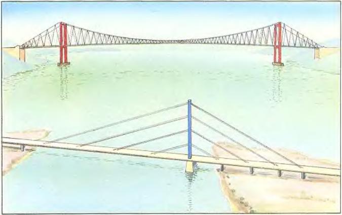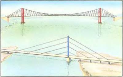 Когда большой город расположен на множестве островов, то мосты, конечно, играют в нем очень важную роль. Именно так обстоит дело в Санкт-Петербурге: он лежит в дельте реки Невы, состоящей из нескольких рукавов и изрезанной сетью естественных и искусственных каналов, так что без огромного количества мостов городская жизнь здесь была бы просто невозможной. И однако начиналась она без всяких мостов. Царь Петр I в начале XVIII в. перенес столицу России из Москвы на берега Невы для выхода в Балтийское море и решил сделать из русских нацию мореходов. Чтобы приучить их жить на воде, жителям новой столицы было запрещено передвигаться внутри города по суше, а велено только по рекам и каналам. Образцами для Санкт-Петербурга царь избрал Амстердам и Венецию. Оба эти города были прорезаны таким множеством каналов, что жители их передвигались в основном по воде. Но и мостов там было очень много. Самый первый мост был и самым простым: на деревянных сваях и с бревенчатыми пролетами. Его берегут и по сей день как историческую ценность и все время подновляют — ведь дерево быстро гниет в пресной воде. Позже царь велел делать мосты по голландскому образцу — подъемными, чтобы пропускать суда. Мосты эти были очень похожи на те, что показаны на с. 40. Поскольку они были деревянными, то к концу XVIII в. совсем обветшали. В 1780-х гг. при императрице Екатерине II многие мосты построили заново, уже из камня, хотя средний пролет делали опять деревянным и подъемным. В конце XIX в. его всюду заменили неподвижным — каменным или металлическим, но на память о старине оставили цепи, которыми раньше поднимался деревянный пролет. Два таких удивительно красивых моста, Чернышев и Старо-Калинкин, с башенками (в них когда-то работал подъемный механизм) и цепями, стоят на Фонтанке.